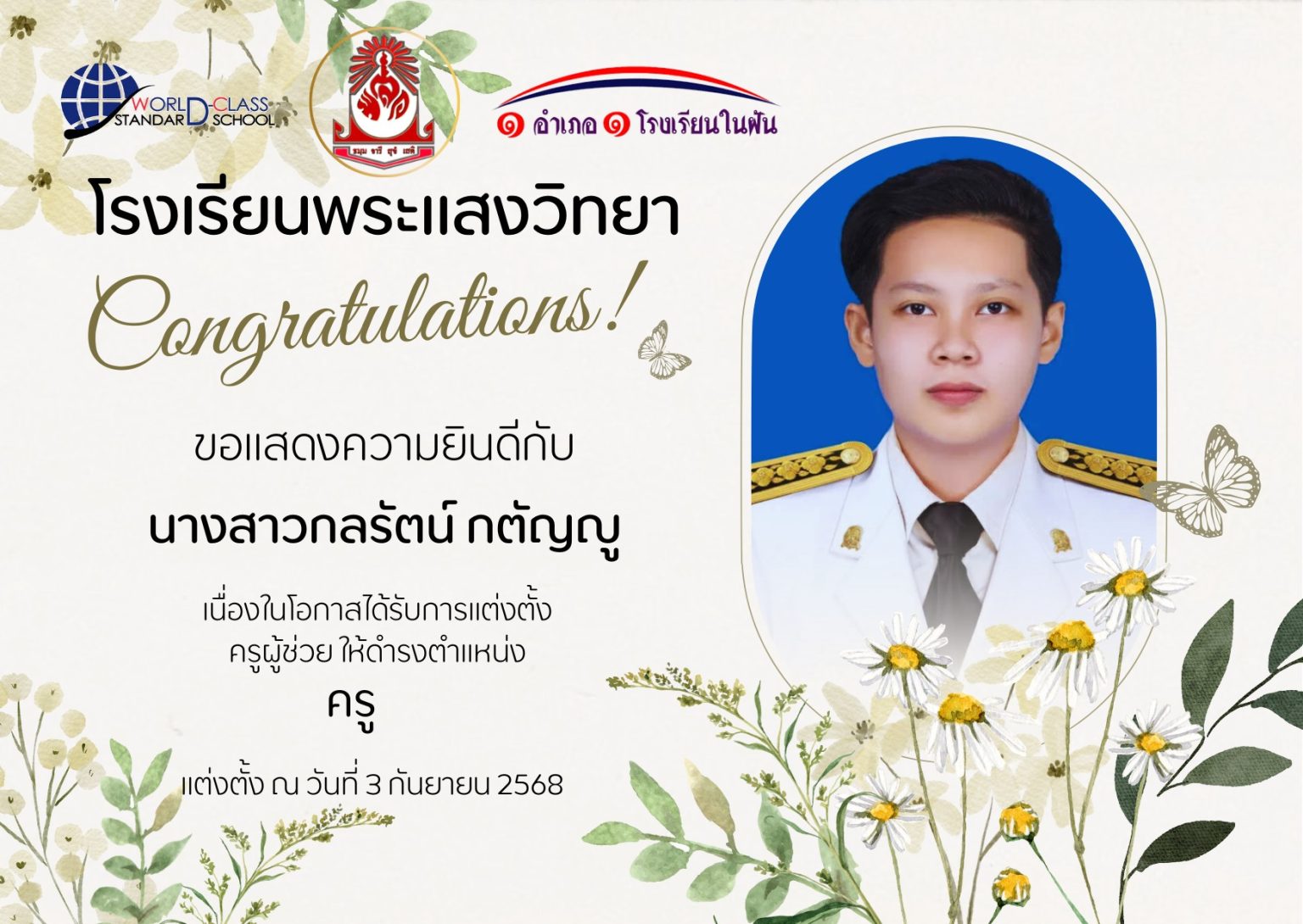 ขอแสดงความยินดีกับคุณครูกลรัตน์ กตัญญู เนื่องในโอกาสได้รับการแต่งตั้งครูผู้ช่วย ให้ดำรงตำแหน่ง ครู