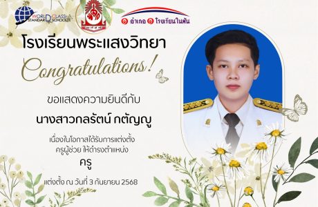 ขอแสดงความยินดีกับคุณครูกลรัตน์ กตัญญู เนื่องในโอกาสได้รับการแต่งตั้งครูผู้ช่วย ให้ดำรงตำแหน่ง ครู